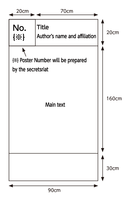 | ● | The size of poster board is 160 cm tall × 90 cm wide (This is the size of the main text area). Do not exceed the size of the board. |