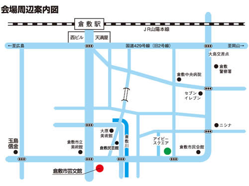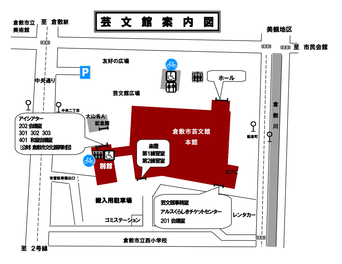 倉敷吉岡線・倉敷循環線(両備バス)、塩生線・古城池線(下電バス)で「中央二丁目倉敷芸文館」停留所で下車(約10分)