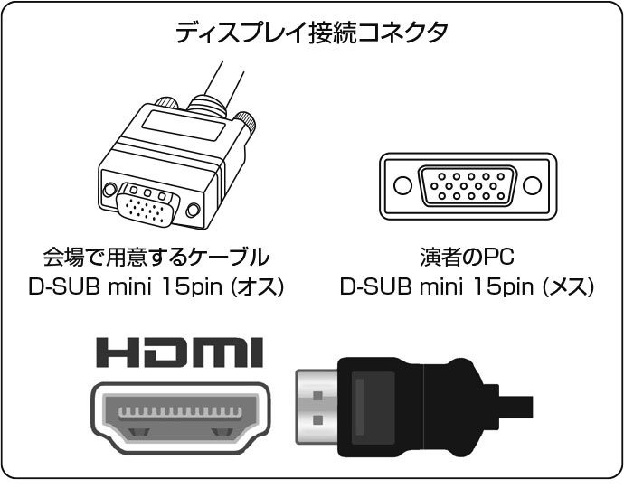 会場で用意するPCケーブルコネクタの形状は、D-SUB mini 15pinまたはHDMIです。この出力端子を持つPCをご用意いただくか、この形状に変換するコネクタを必要とする場合には必ずご持参ください。電源ケーブルもお忘れなくお持ちください。 |