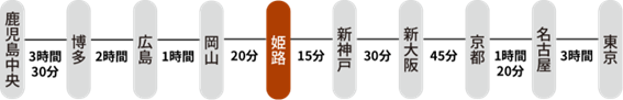 ・大阪方面から約60分・・・新快速:大阪駅→(20分)→三ノ宮駅→(40分)→姫路駅