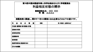発表スライド(最初か2枚目)に所定の様式により開示してください。
