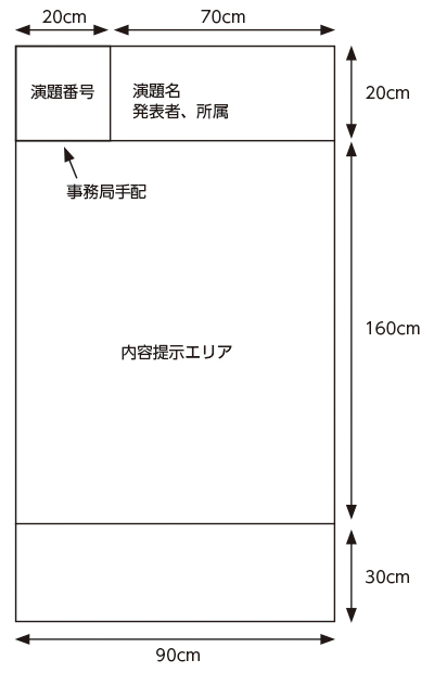| 3) | 3)幅70 × 20cm の上部スペースに演者の演題名、所属、発表者(演者に○)を、幅90 × 160cm のスペースに本文等を掲示してください。演題番号は事務局にて準備します。 なお、ポスター発表者は配布資料(A3判ないしA4判に縮小したポスターあるいは発表内容をまとめたもの)30部をご用意ください。 |